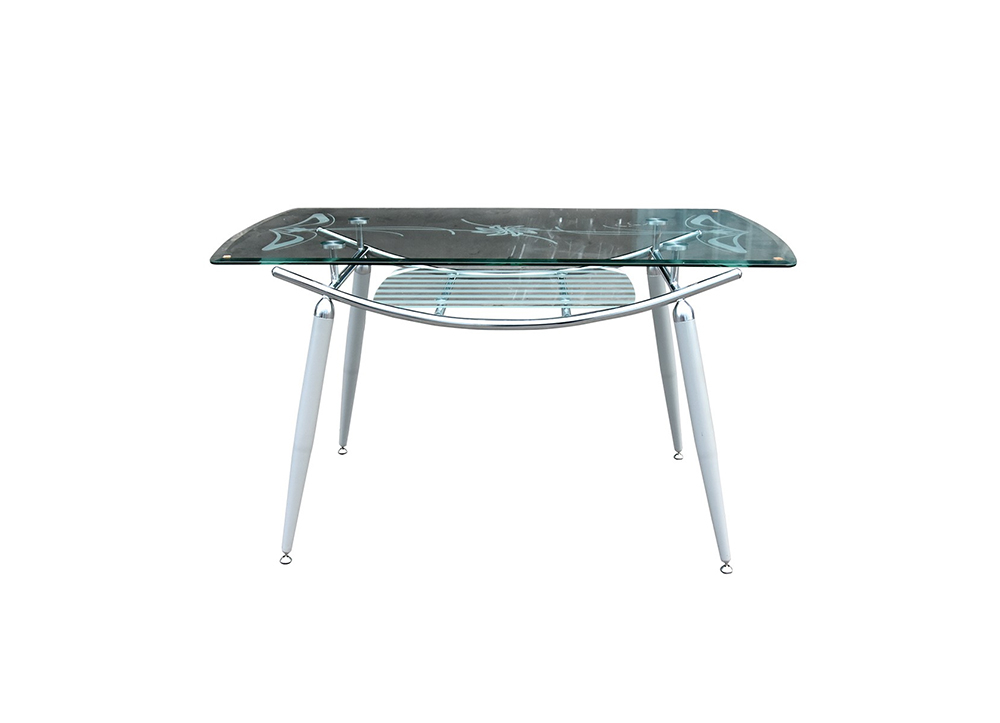 Bàn ăn khung thép mạ, mặt kính tròn, bàn có ngăn bàn gỗ sơn PU