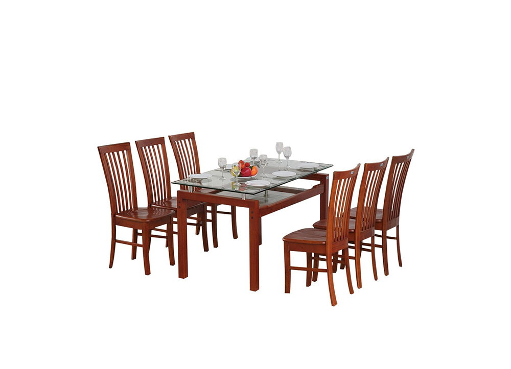 Bộ bàn ghế ăn gỗ tự nhiên sơn phủ Pu cao cấp, mặt bàn bằng kính cường lực và có ngăn ở dưới.