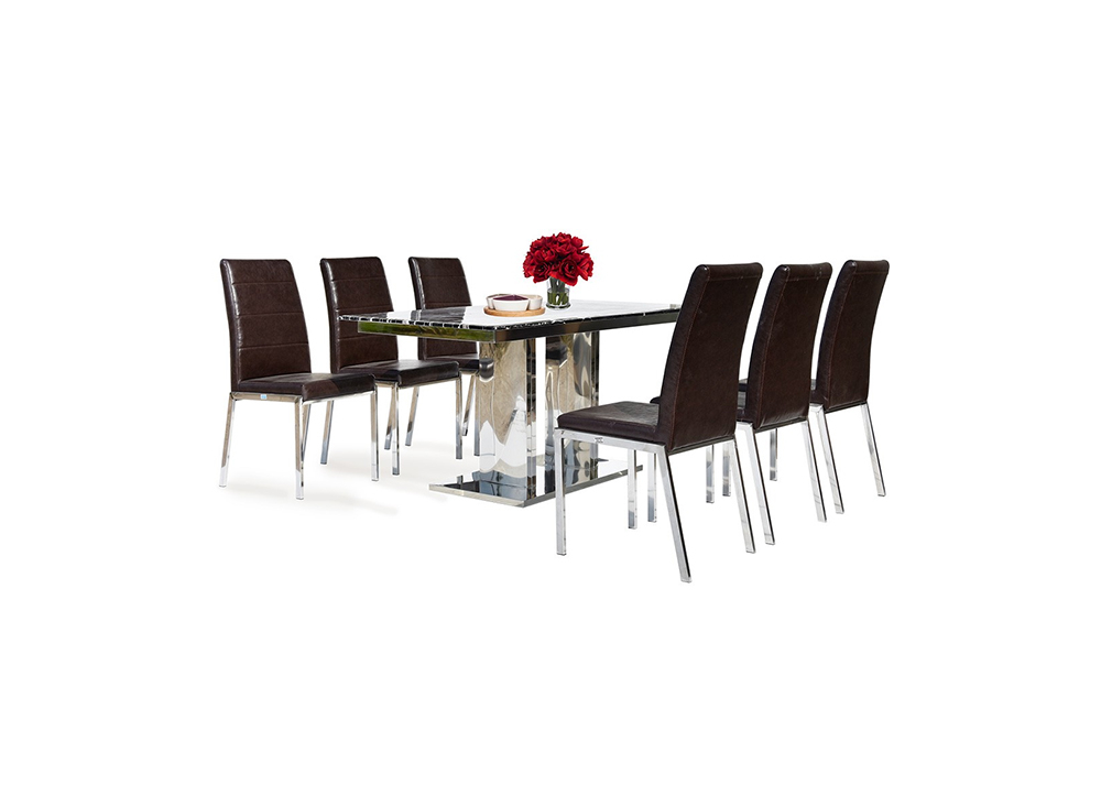 Bộ bàn ghế ăn cao cấp khung Inox, mặt bàn ăn sử dụng chất liệu đá tự nhiên phủ vân nhân tạo.