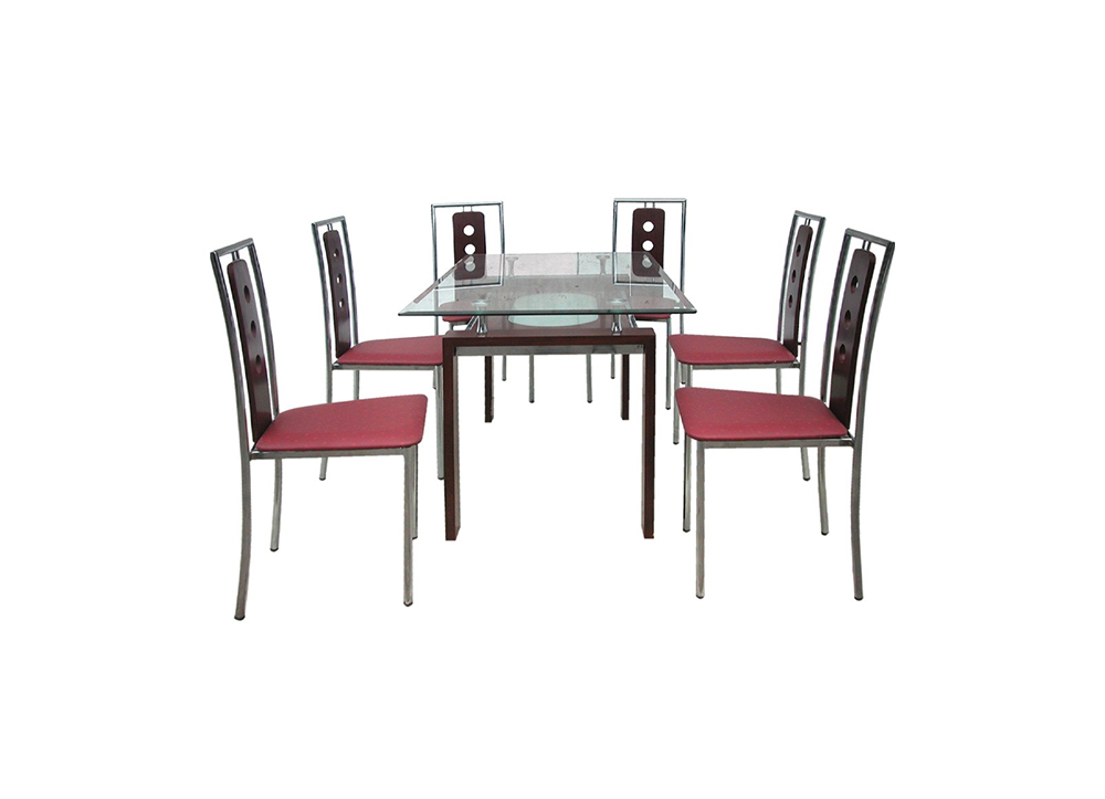 Bàn ăn mặt kính, khung là sự kết hợp gỗ tự nhiên với khung thép mạ, có ngăn bàn.