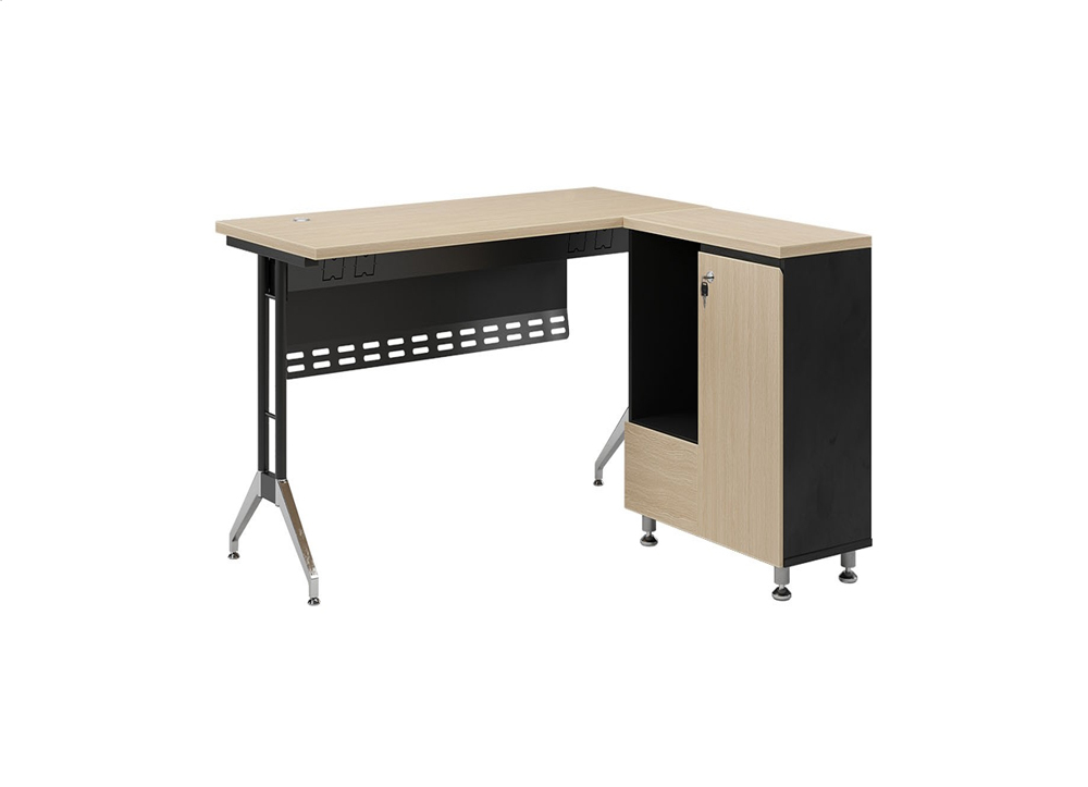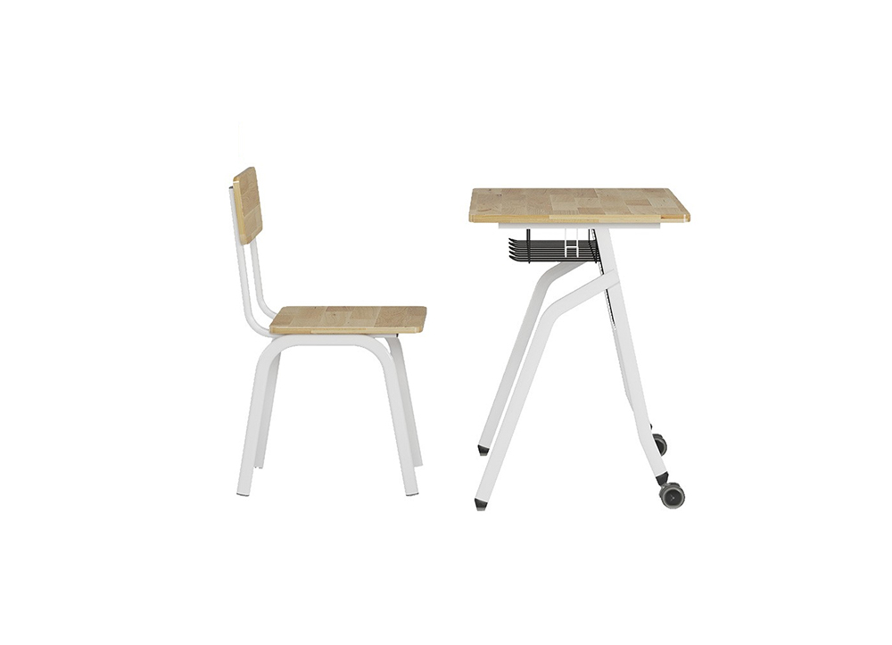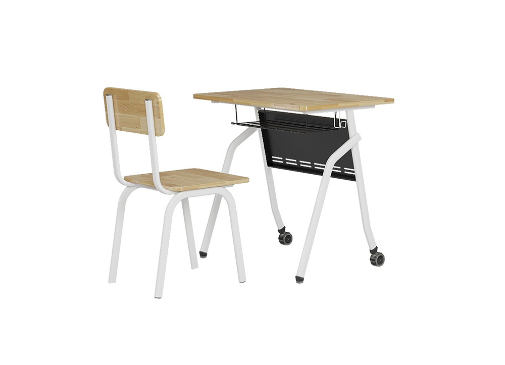 Bộ bàn ghế học sinh khung thép sơn trắng, yếm + ngăn bàn sơn đen. Mặt bàn + đệm tựa ghế gỗ tự nhiên được phủ một lớp sơn trong suốt để bảo vệ bề mặt và giữ được mầu sắc nguyên bản của gỗ. Chân trước bàn có trang bị bánh xe có hãm thuận tiện cho việc di chuyển.