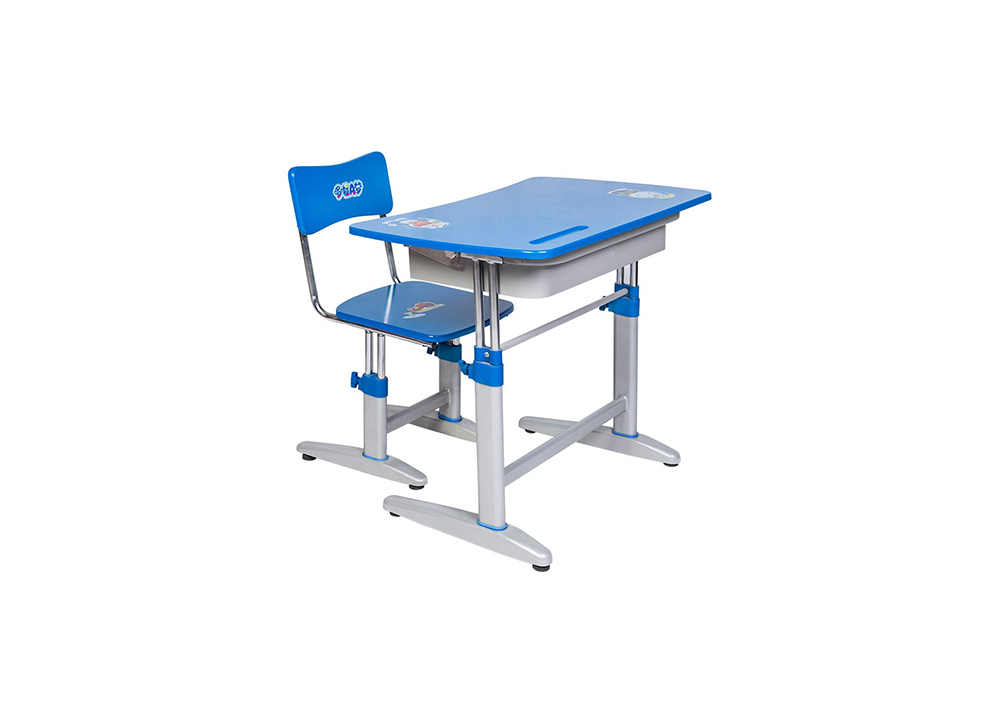 Bộ bàn ghế học sinh khung thép, mặt bàn và đệm tựa ghế bằng gỗ sơn PU con giống.