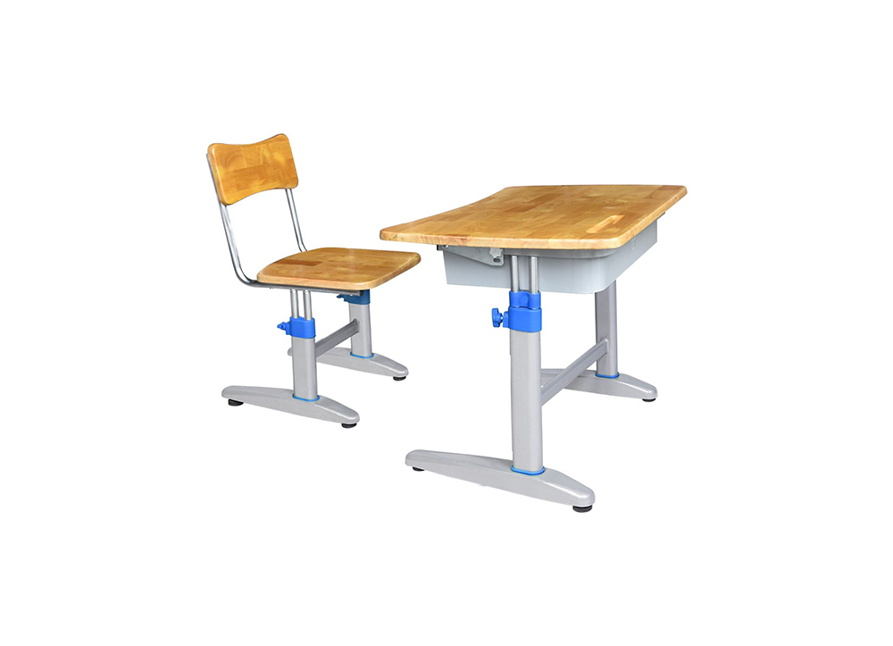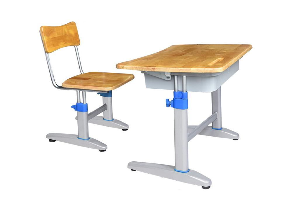 Bộ bàn ghế học sinh khung thép sơn tĩnh điện, mặt bàn và đệm tựa ghế làm bằng gỗ tự nhiên.