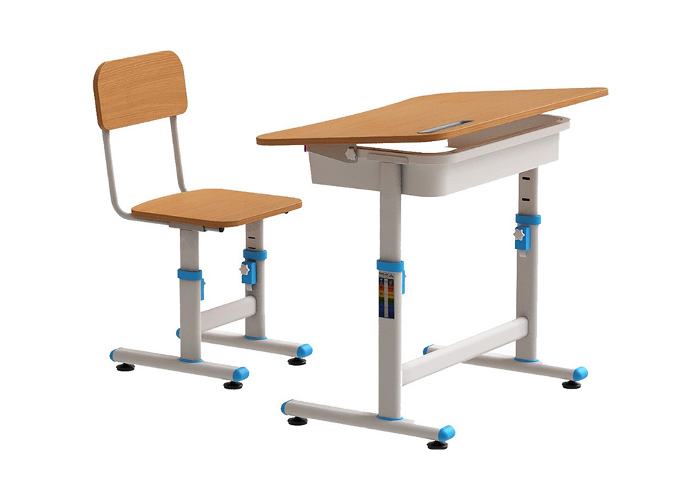 Mặt bàn và đệm tựa ghế bằng gỗ Melamine, bàn có ngăn để sách và có thể điều chỉnh độ nghiêng của mặt bàn phù hợp với tư thế ngồi học.