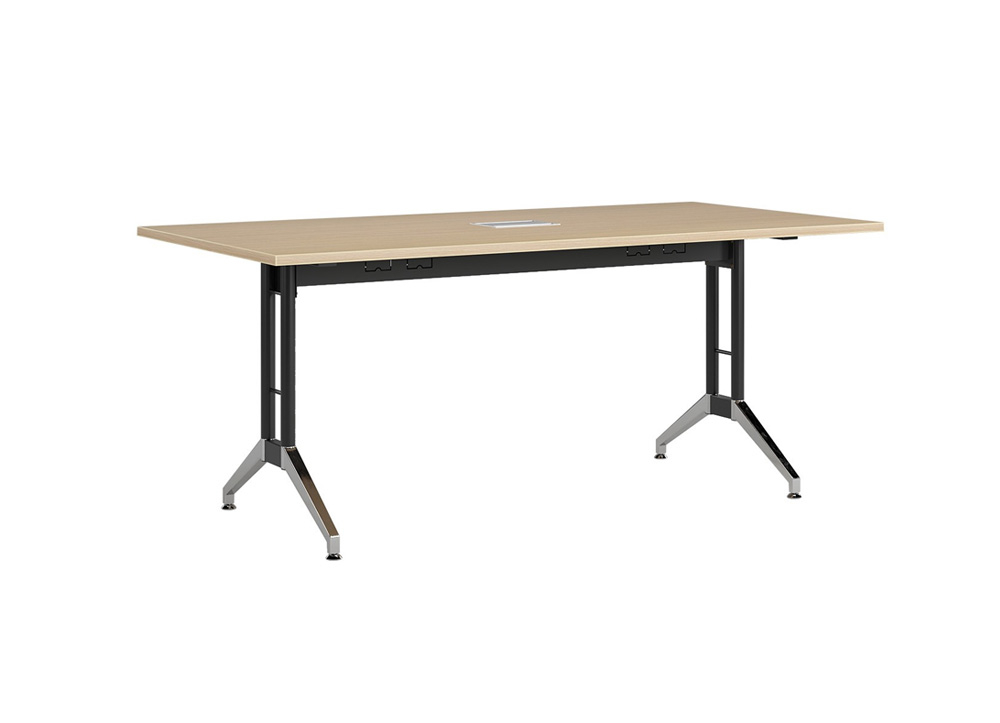 Bàn họp cao cấp mặt gỗ meleamin, kết hợp chân bàn ống thép sơn đen và mạ. Bàn có máng và hộp điện kết hợp làm khung giằng với kết cấu chắc chắn và tiện ích khi sử dụng.
