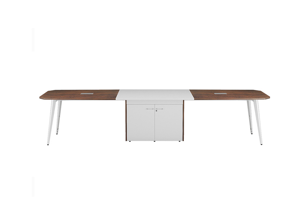 Bàn họp sử dụng khung thép dập định hình sơn tĩnh điện, kết hợp mặt gỗ melamin cao cấp. Bàn có hệ thống tủ để đồ ở phía dưới tạo nên sự tiện lợi cho người sử dụng.