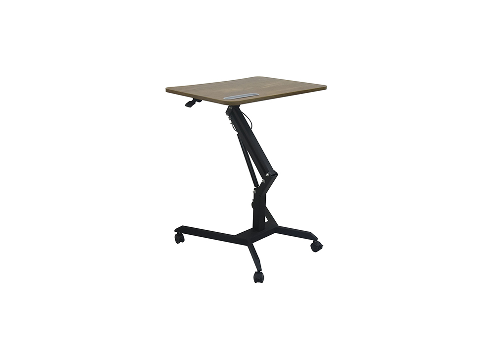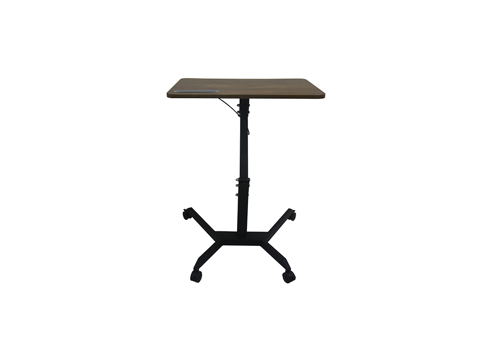 Bàn làm việc khung thép sơn tĩnh điện, mặt gỗ melamine màu vân gỗ. Khung bàn có thể điều chỉnh độ cao thấp tùy theo nhu cầu sử dụng. Chân đế có 4 bánh xe di động có khóa hãm.
