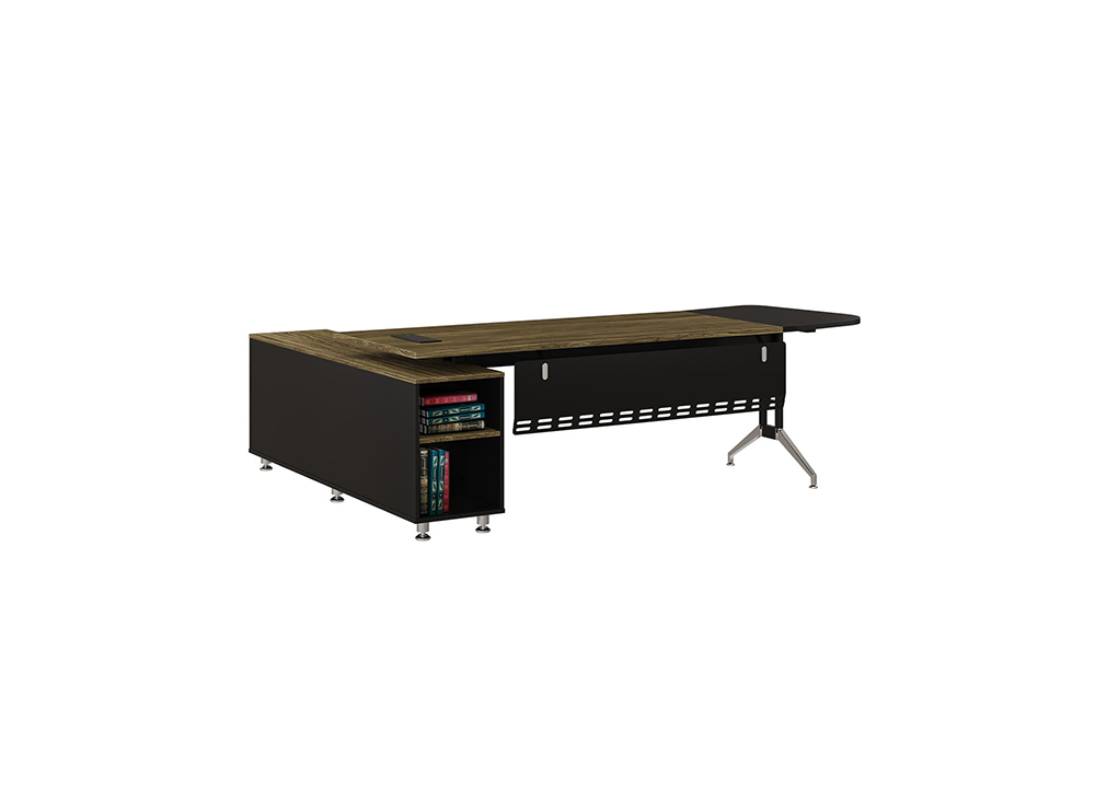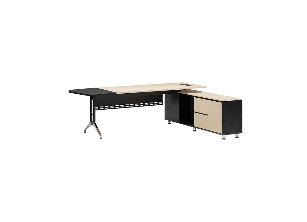 Bàn lãnh đạo chất liệu melamine, chân mạ C12, mặt bàn có tấm nối gỗ đen tạo điểm nhấn, tủ phụ liền bàn có vị trí để CPU, cánh mở và 2 ngăn kéo.