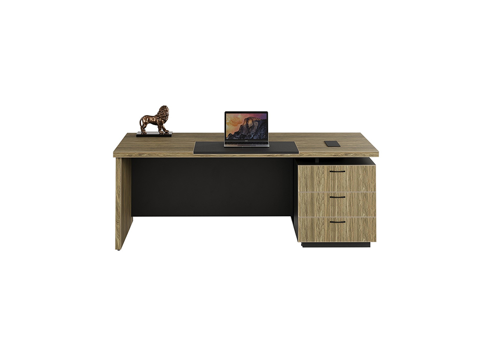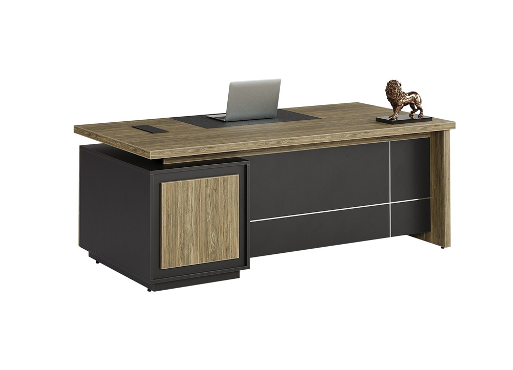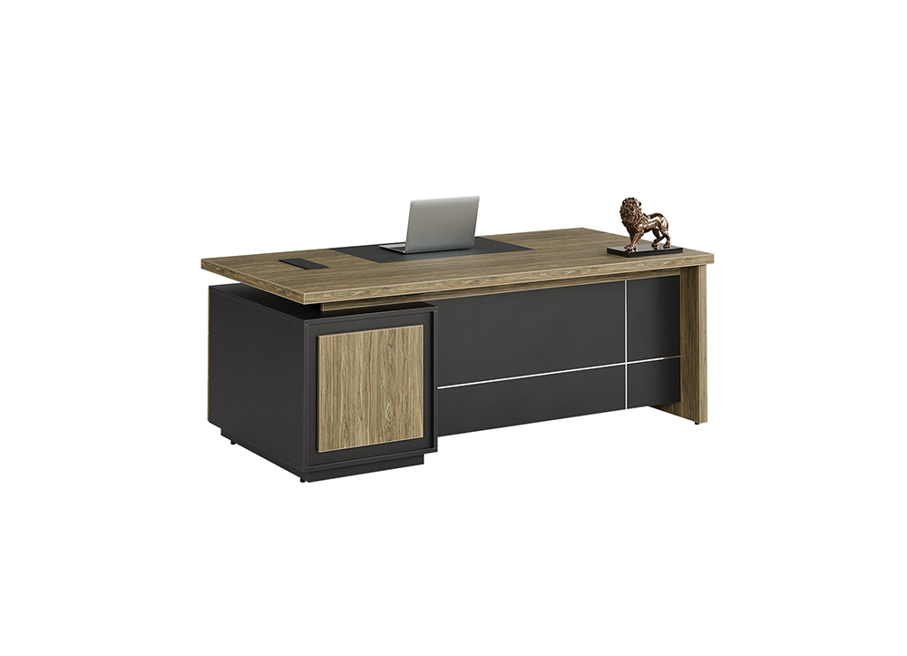 Bàn lãnh đạo cao cấp, mặt bàn có tấm PVC đen ốp giữa, yếm gắn nẹp nhôm. Bàn có hộc liền bàn tích hợp vị trí để CPU, phần trước có ốp vân gỗ trang trí
