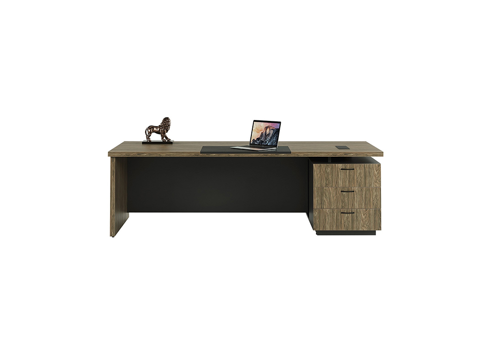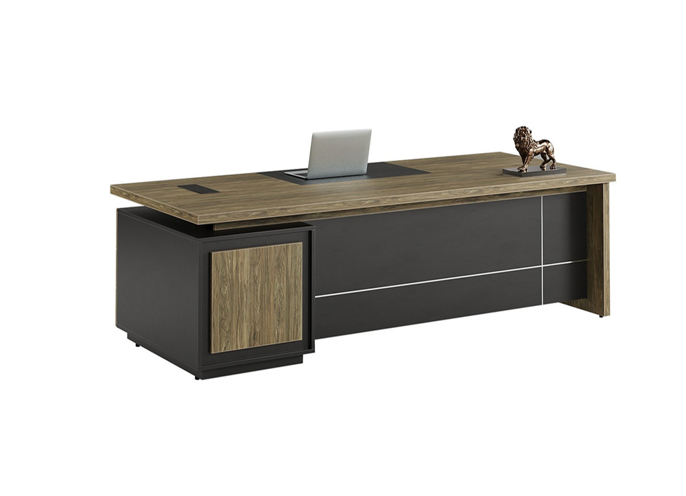 Bàn lãnh đạo cao cấp, mặt bàn có tấm PVC đen ốp giữa, yếm gắn nẹp nhôm. Bàn có hộc liền bàn tích hợp vị trí để CPU, phần trước có ốp vân gỗ trang trí