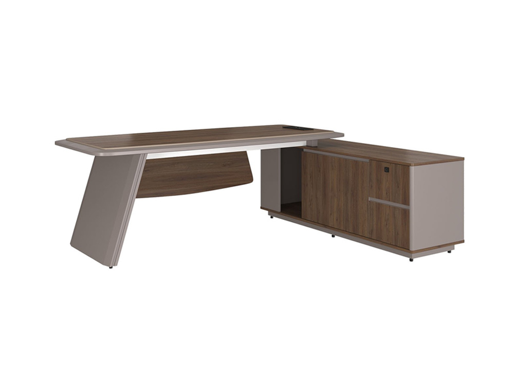Bàn lãnh đạo LUXURY SUPREME S3 chất liệu gỗ sơn+ melamine. Mặt bàn hình tang trống. có 01 nắp hộp điện, Kiểu dáng hiện đại, sang trọng, góc cạnh mặt bàn được bo tròn đều. Tủ phụ có kèm khóa cảm ứng vân tay tại ngăn kéo.