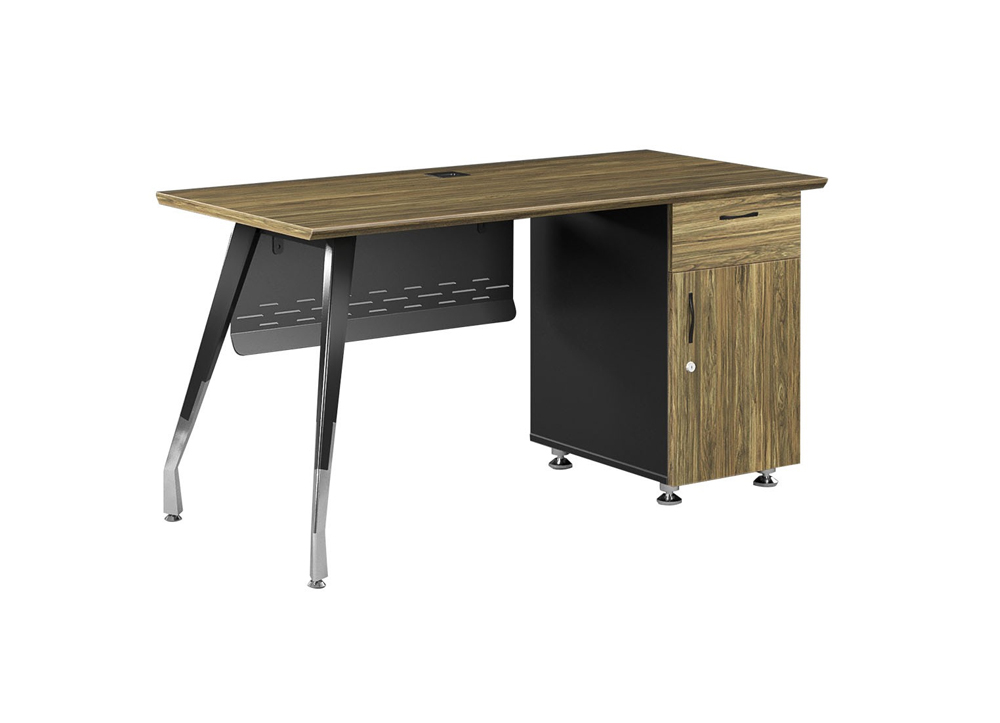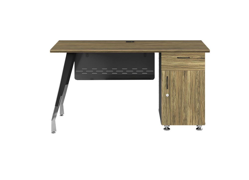 • Bàn chuyên viên hộc liền cao cấp mặt gỗ melamine vát cạnh 45 độ hai cạnh dài, có yếm tôn, kết hợp chân bàn thép dập định hình sơn đen nhám kết hợp mạ