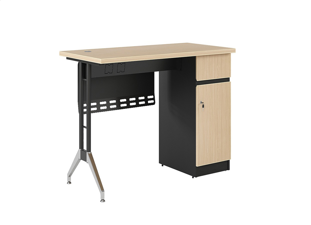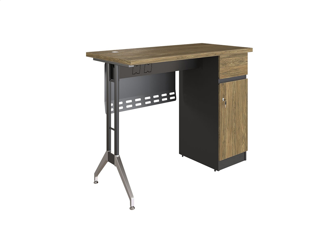 Bàn chuyên viên hộc liền cao cấp mặt gỗ meleamin, có yếm tôn, kết hợp chân bàn ống thép sơn đen và mạ. Bàn có máng điện kết hợp làm khung giằng với kết cấu chắc chắn và tiện ích khi sử dụng. Hộc liền gồm 1 ngăn kéo và 1 cánh mở, sử dụng tay nắm vát cạnh và có ổ khóa.