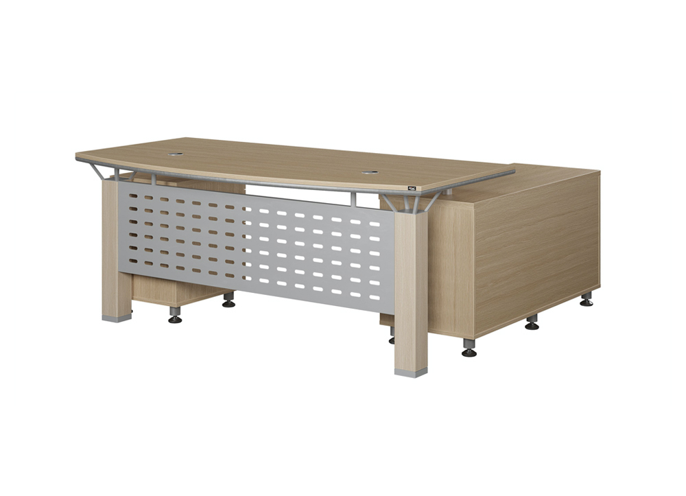 Bàn lãnh đạo gỗ Melamine, mặt bàn lượn cong có ốp gỗ sơn trang trí ở phía dưới, yếm tôn đột lỗ trang trí