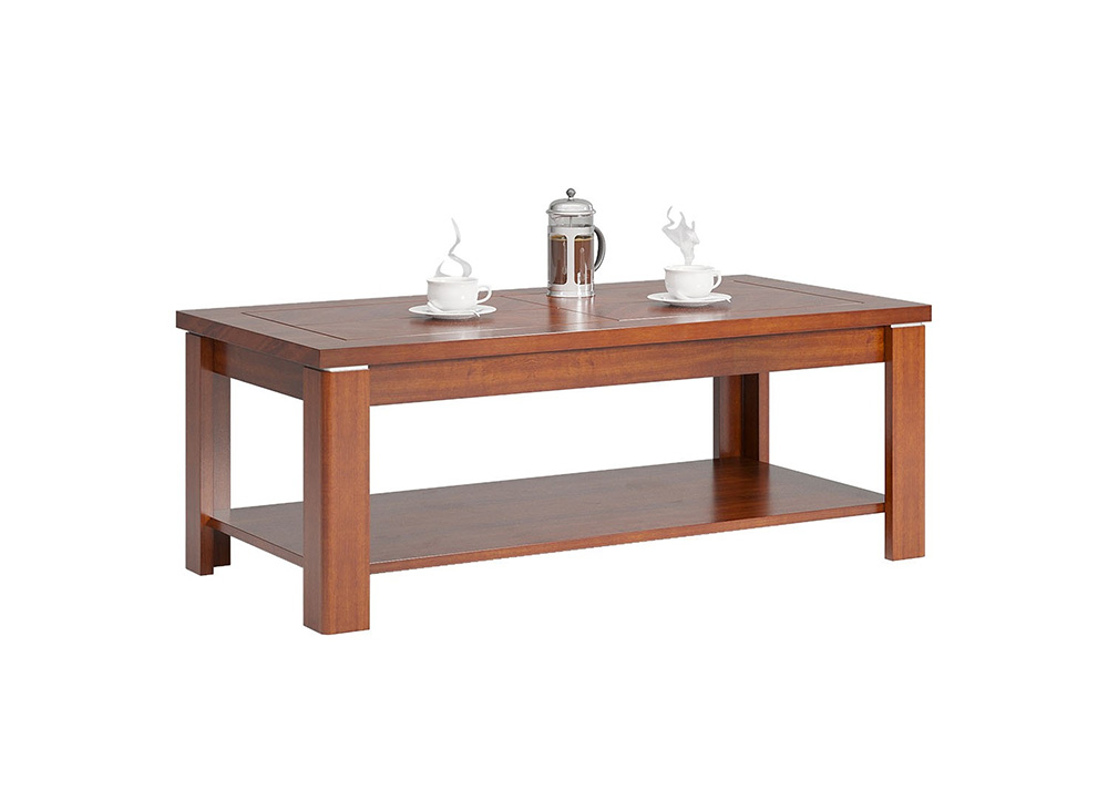 • Bàn sofa mặt gỗ liền hình chữ nhật, chân bàn ghép chữ V tạo dáng và có đợt gỗ để đồ.