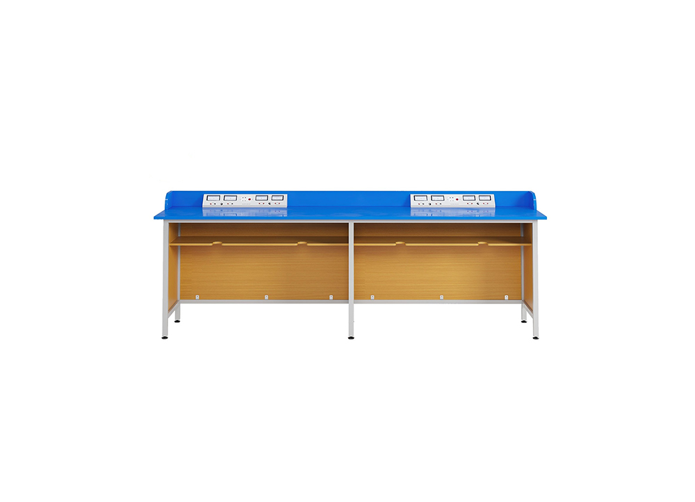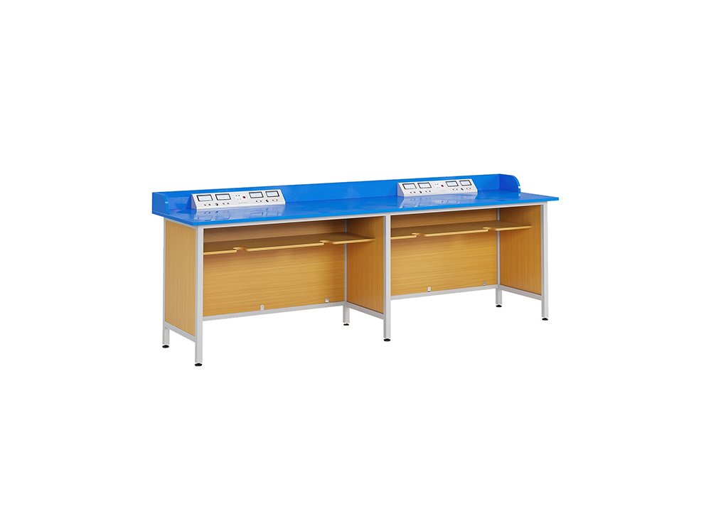 Bàn thí nghiệm vật lý 4 chỗ , khung thép sơn tĩnh điện. Mặt bàn composite cách điện có độ bên cơ học cao, kết hợp ốp vách gỗ melamine. Bàn có 02 hộp điện tích hợp đồng hồ đo ampeke + Vol kế AC và DC kèm ổ cắm điện tiện dụng