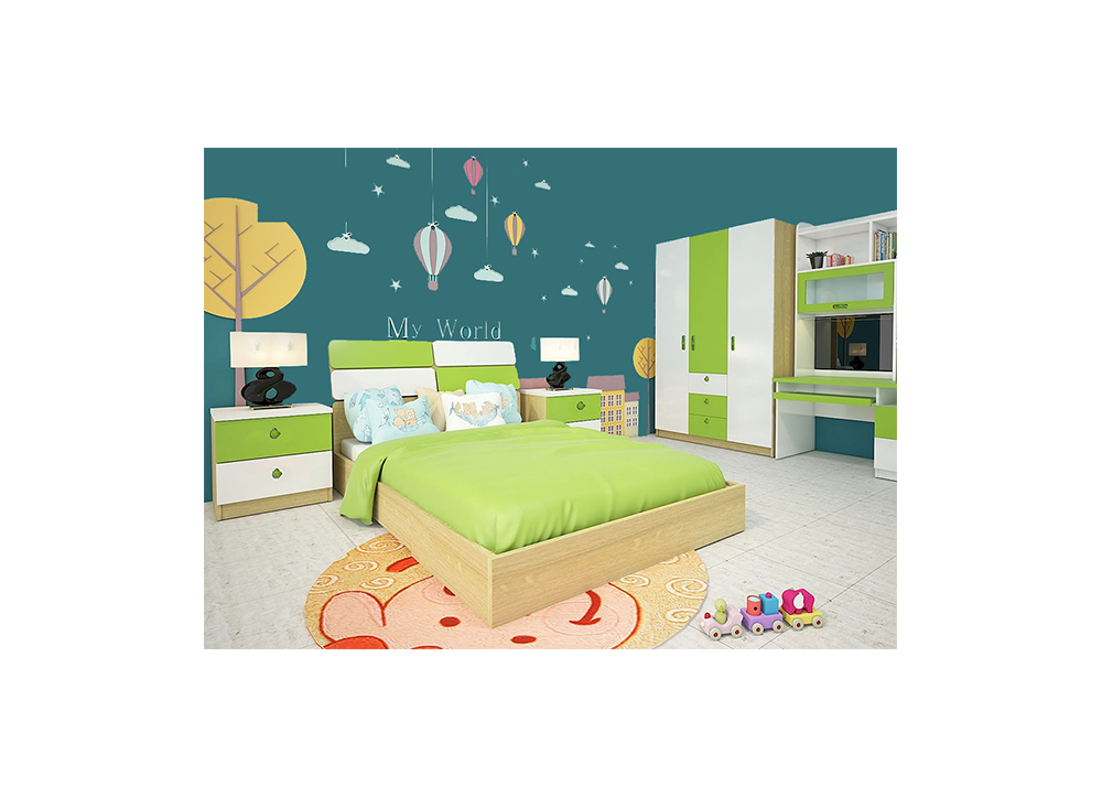 • Bộ sản phẩm phòng ngủ trẻ em, sử dụng chất liệu gỗ melamine cao cấp kết hợp giữa hai tông màu xanh cốm và trắng.