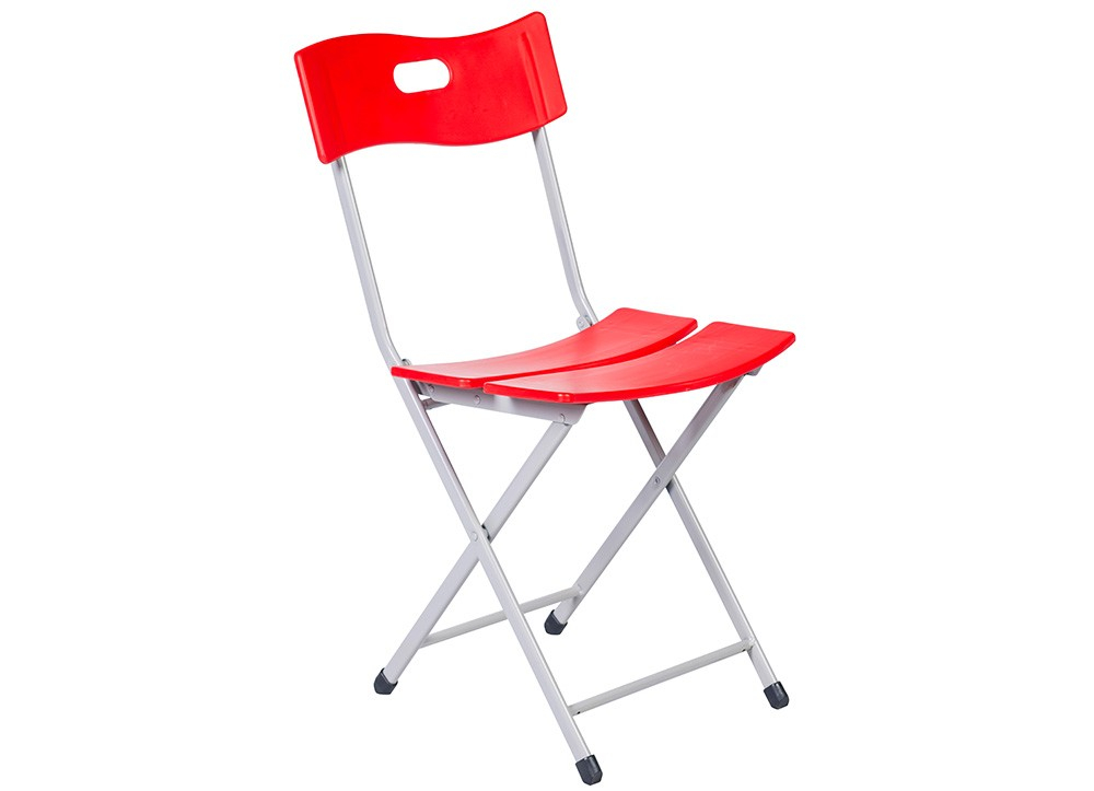 Ghế chân gấp khung thép, đệm tựa bằng nhựa.