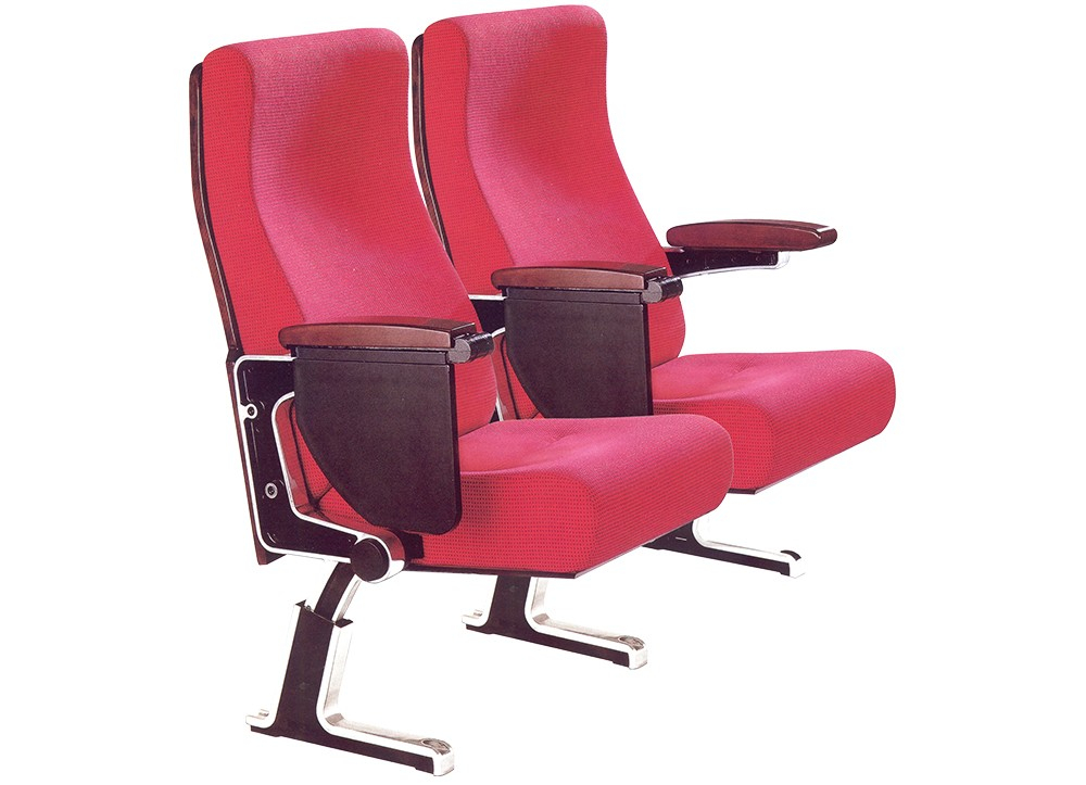 Ghế hội trường cao cấp sử dụng khung nhôm đúc, đệm tựa ghế mút đúc bọc vải và ốp đệm tựa bằng gỗ.