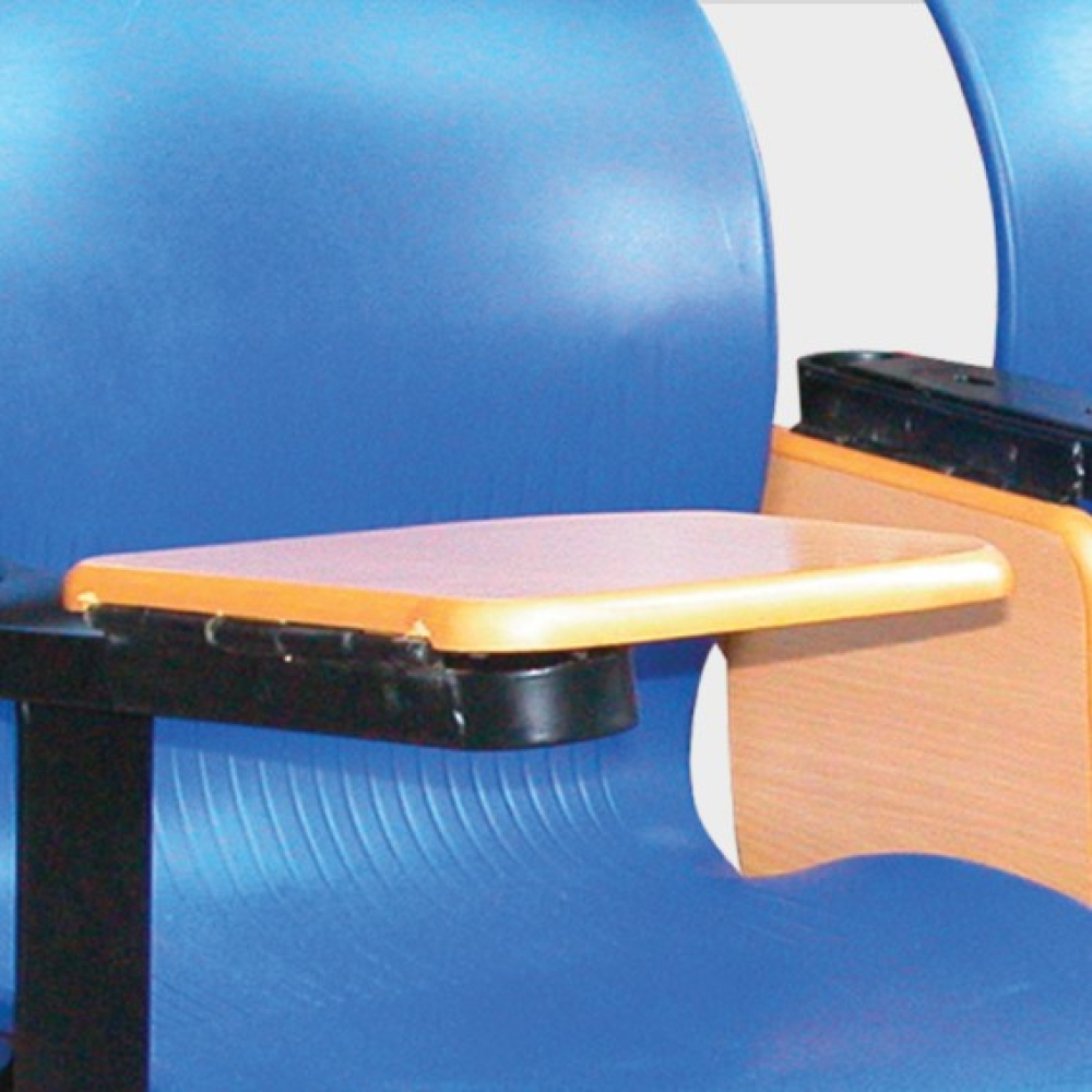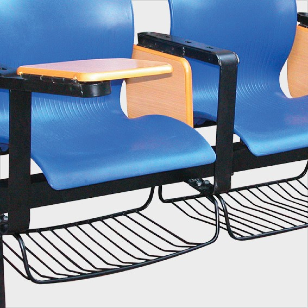 Ghế dùng đệm tựa nhựa, có bàn viết gỗ và giỏ để đồ.