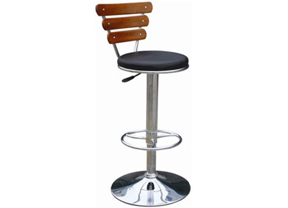 Ghế quầy bar khung thép mạ có tựa gỗ tự nhiên, đệm ghế bọc PVC và có thể điều chỉnh được độ cao.