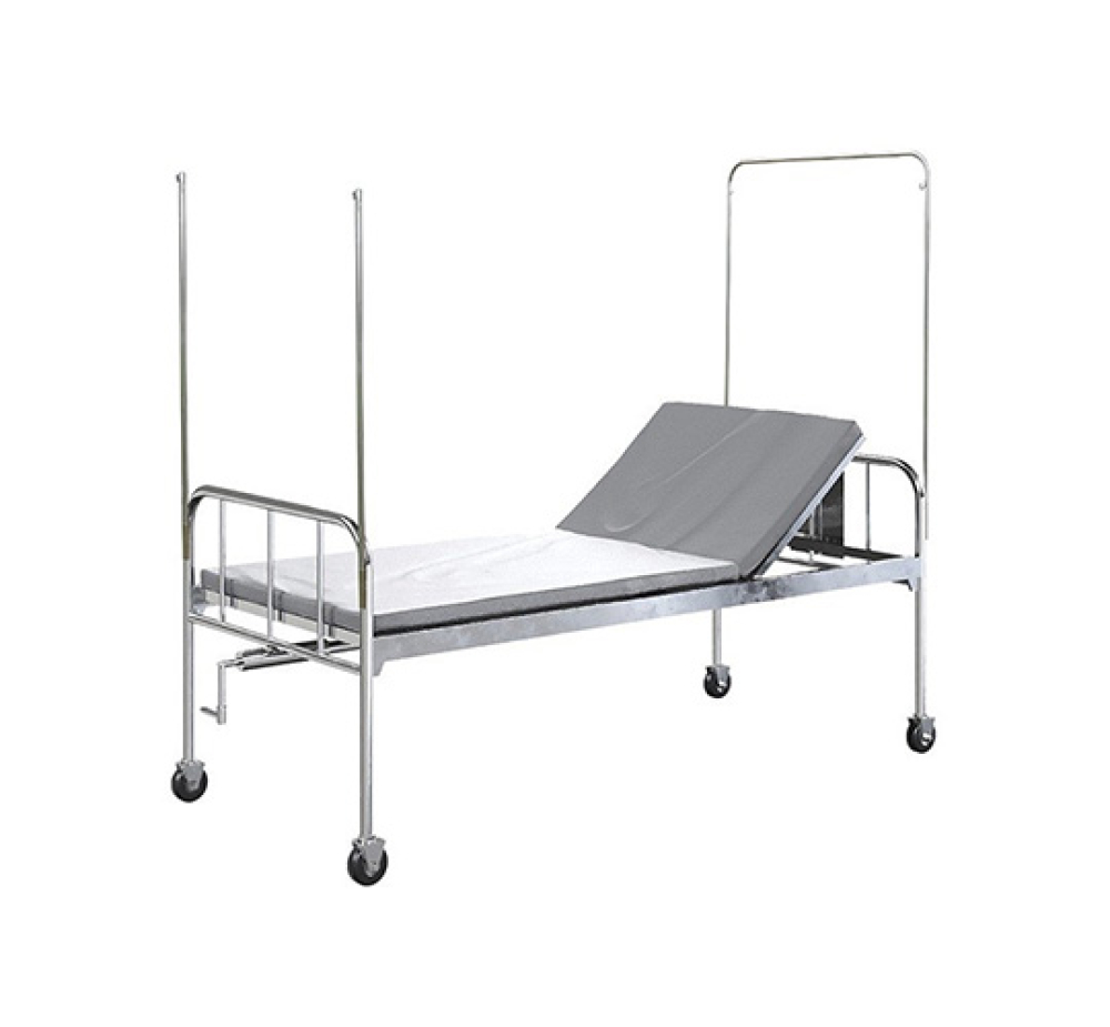 Giường y tế chân di động toàn bộ khung bằng Inox hoặc thép sơn tĩnh điện, đầu giường có thể nâng hạ bằng cơ cấu tay quay.