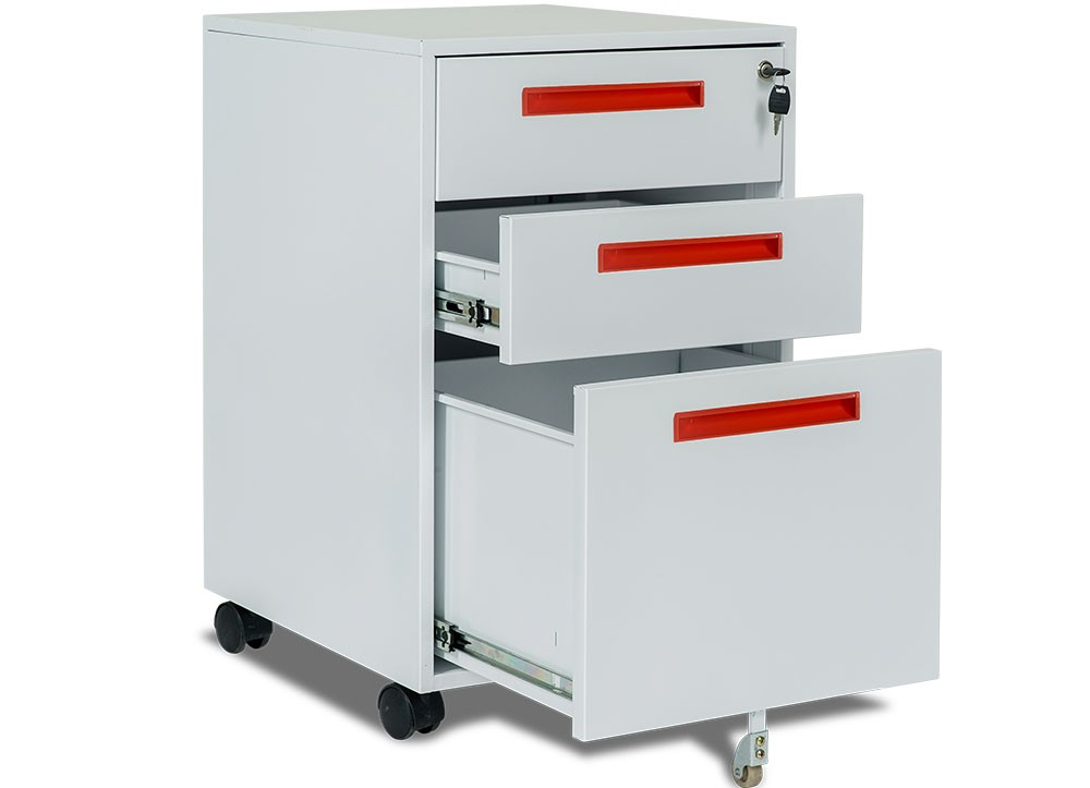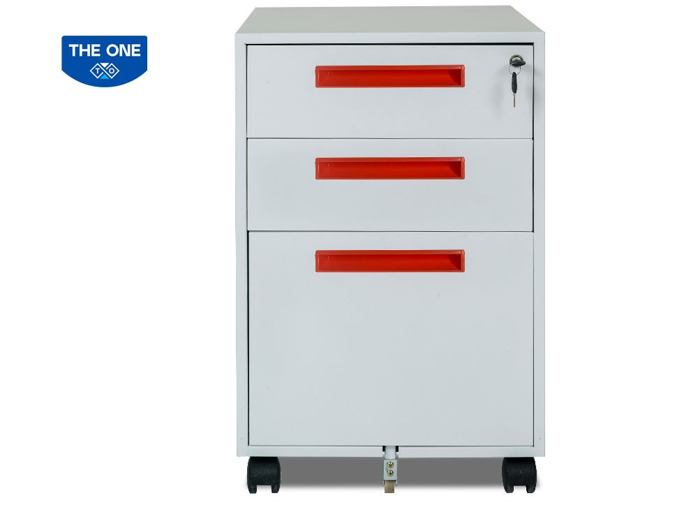 Hộc sắt di dộng 3 ngăn kéo sử dụng thép sơn tĩnh điện màu trắng sáng phù hợp với không gian văn phòng hiện đại.