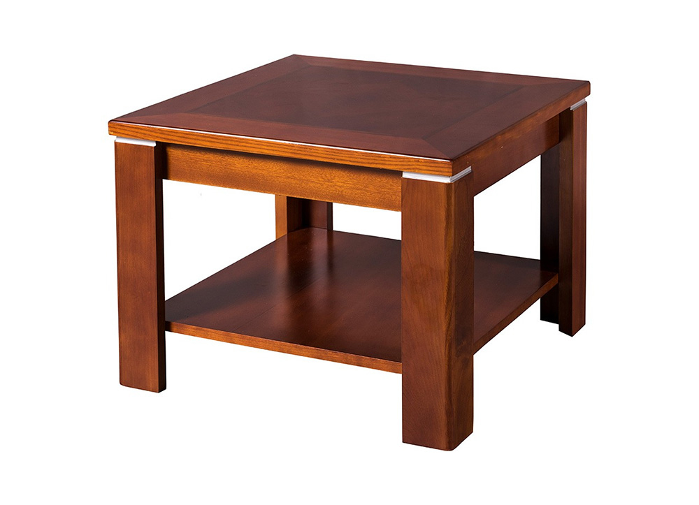 Kệ góc sofa mặt gỗ liền hình chữ nhật, chân ghép chữ V và có đợt để đồ tiện lợi.