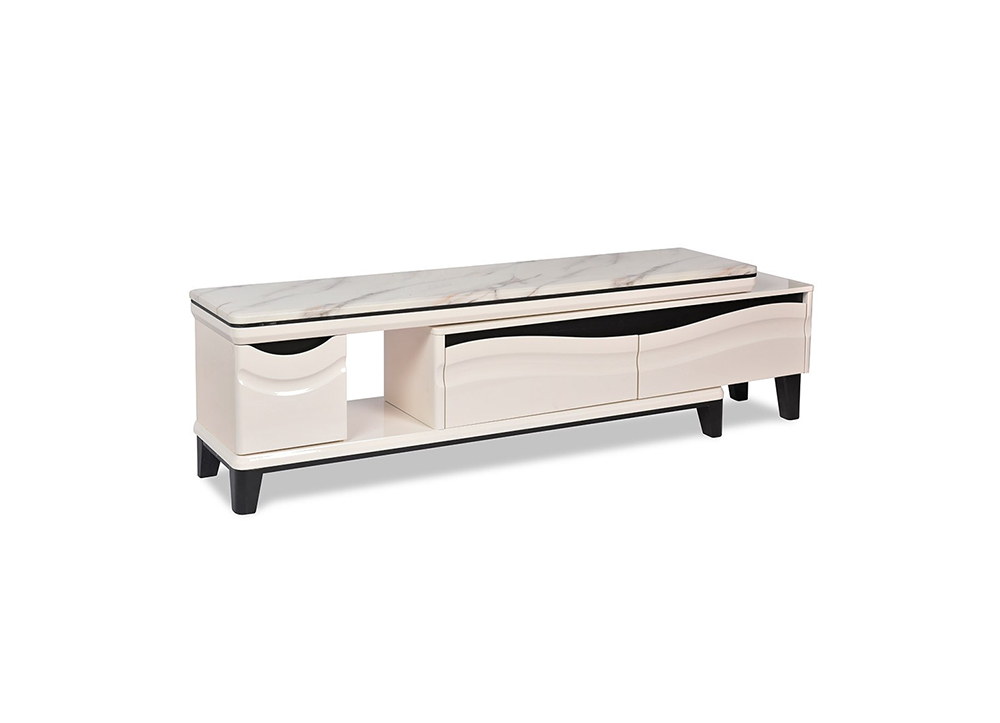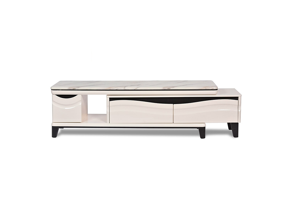 Kệ ti vi cao cấp khung gỗ tự nhiên sơn High Glossy, mặt kệ sử dụng lõi đá tự nhiên phủ vân nhân tạo.