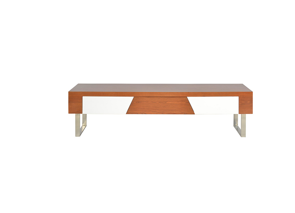 Kệ tivi cao cấp dùng khung Inox, phần gỗ bằng Veneer óc chó kết hợp sơn trắng High Glossy.