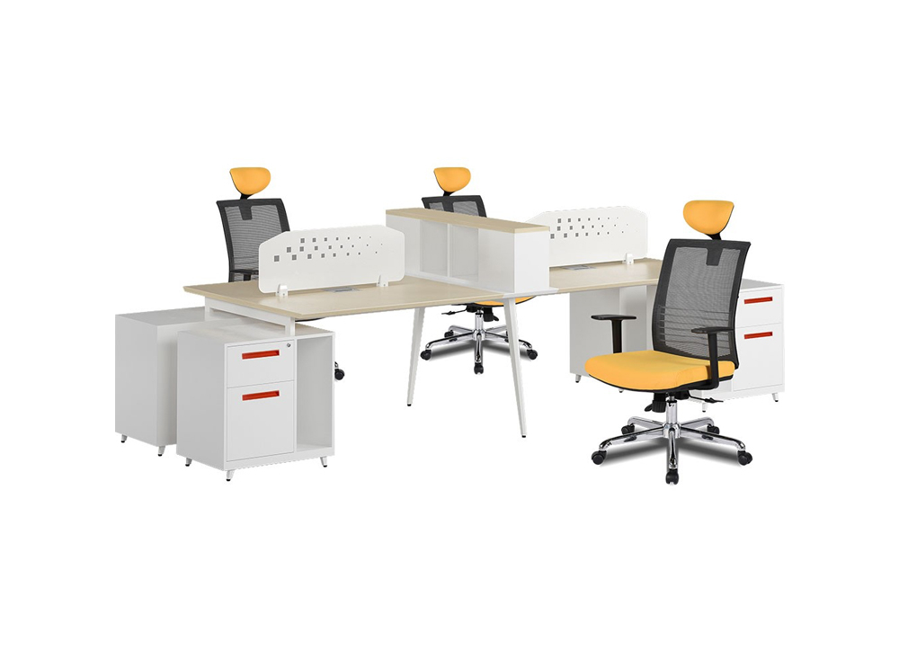 Module làm việc cho nhân viên sử dụng chân thép sơn tĩnh điện C10, đầu các bàn làm việc có hộc sắt và khoang để CPU sơn màu trắng, tay nắm ngăn kéo sơn màu cam.