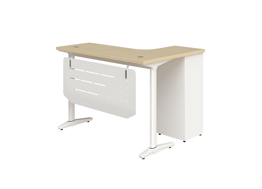 Bàn góc cho trưởng phòng toàn bộ phần chân và hộc sơn màu S26 , tay nắm âm màu cam .Yếm tôn 1.2 mm, cắt trang trí. Mặt bàn màu M14. Mặt trước bàn sử dụng 2 chân sắt, góc ngồi có 1 hộc liền 3 ngăn kéo để tài liệu.