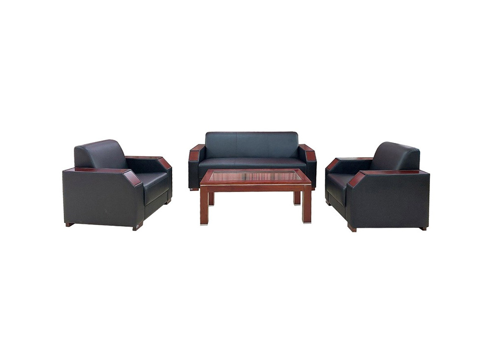 Bộ ghế sofa văn phòng kiểu dáng hiện đại, đệm tựa bọc da thật phần tiếp xúc người sử dụng hoặc PVC. Tay sofa có biên dạng vát, có ốp sơn chìm xuống bề mặt tay. Đế chân gỗ sơn