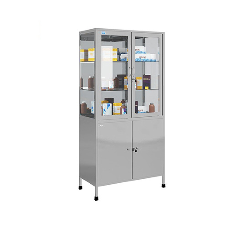 Tủ y tế khung Inox chia làm 2 khoang, khoang trên cánh kính có 2 đợt kính cố định, khoang dưới cánh kín chia 2 ngăn nhỏ. Khung sử dụng ống inox 201 kết hợp tôn inox 430 dày 0.4mm.