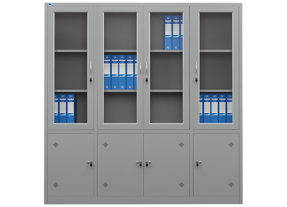 Tủ sắt để tài liệu sơn tĩnh điện gồm 7 khoang, phía trên 3 khoang cánh kính, mỗi khoang có 2 đợt di động.