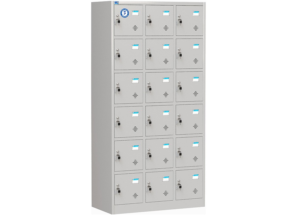 Tủ sắt sơn tĩnh điện 18 khoang cánh mở. Trên mỗi cánh có 1 khóa Locker, núm tay nắm và tai khóa móc.