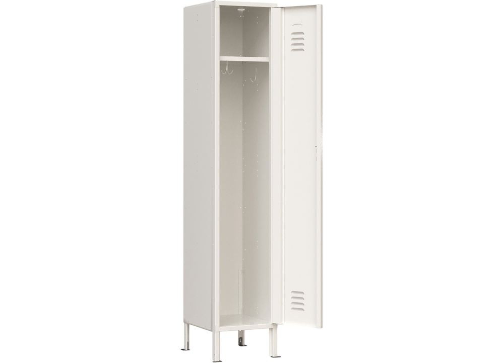 Tủ sắt sơn tĩnh điện màu trắng ngà.Tủ có1 khoang cánh mở, bên trong có 1 đợt cố định và 3 móc treo áo đơn, 1 móc treo áo đôi, Cánh sử dụng tay nắm cao cấp kèm hệ thống thanh khóa tự sập khi đóng