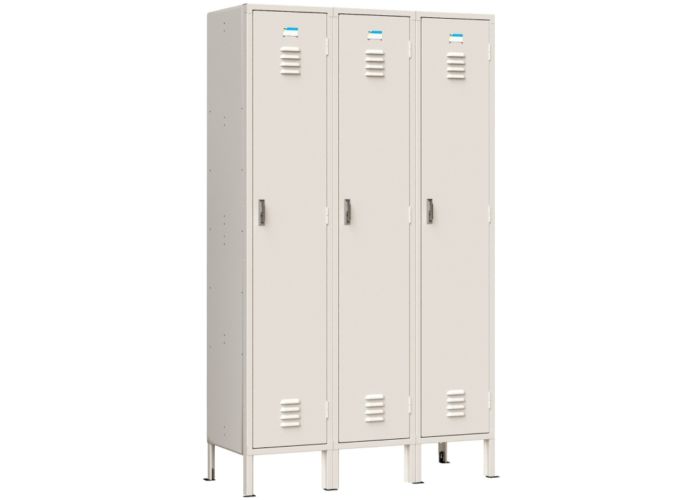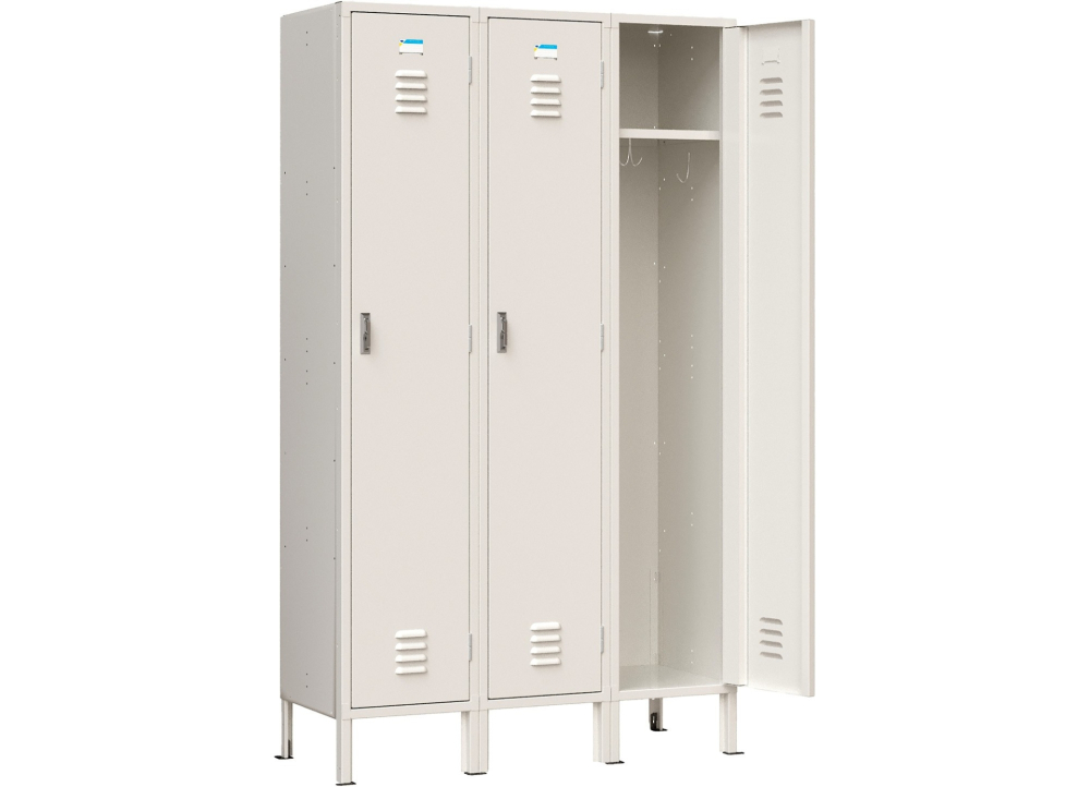 Tủ sắt sơn tĩnh điện màu trắng ngà.Tủ có 3 khoang cánh mở, bên trong mỗi khoang có 1 đợt cố định và 3 móc treo áo đơn, 1 móc treo áo đôi.