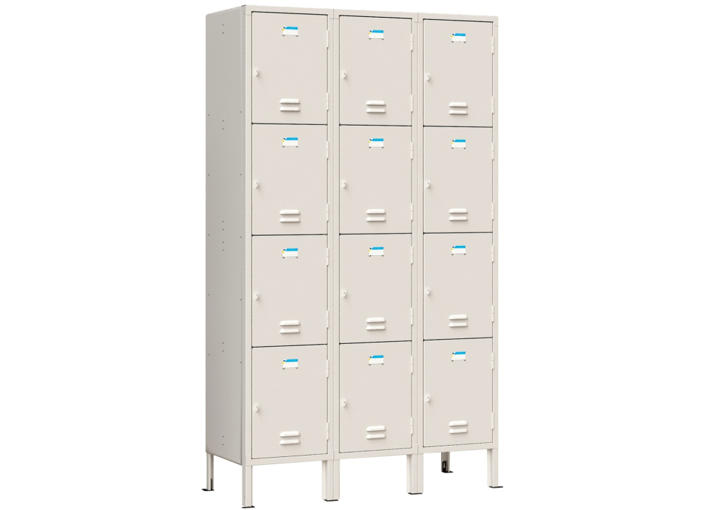 Tủ sắt sơn tĩnh điện màu trắng ngà. Tủ có 12 khoang cánh mở. Trên mỗi cánh có 1 tai khóa móc.