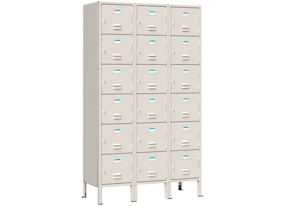 Tủ sắt sơn tĩnh điện màu trắng ngà. Tủ có 18 khoang cánh mở. Trên mỗi cánh có 1 tai khóa móc.