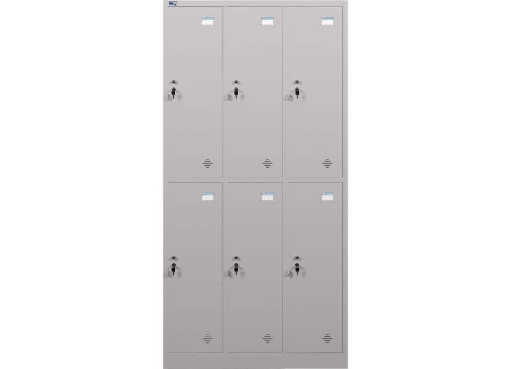 Tủ sắt sơn tĩnh điện 6 khoang cánh mở, bên trong mỗi khoang có 1 đợt cố định và 1 suốt treo quần áo. Trên mỗi cánh có 1 khóa Locker, núm tay nắm và tai khóa móc.