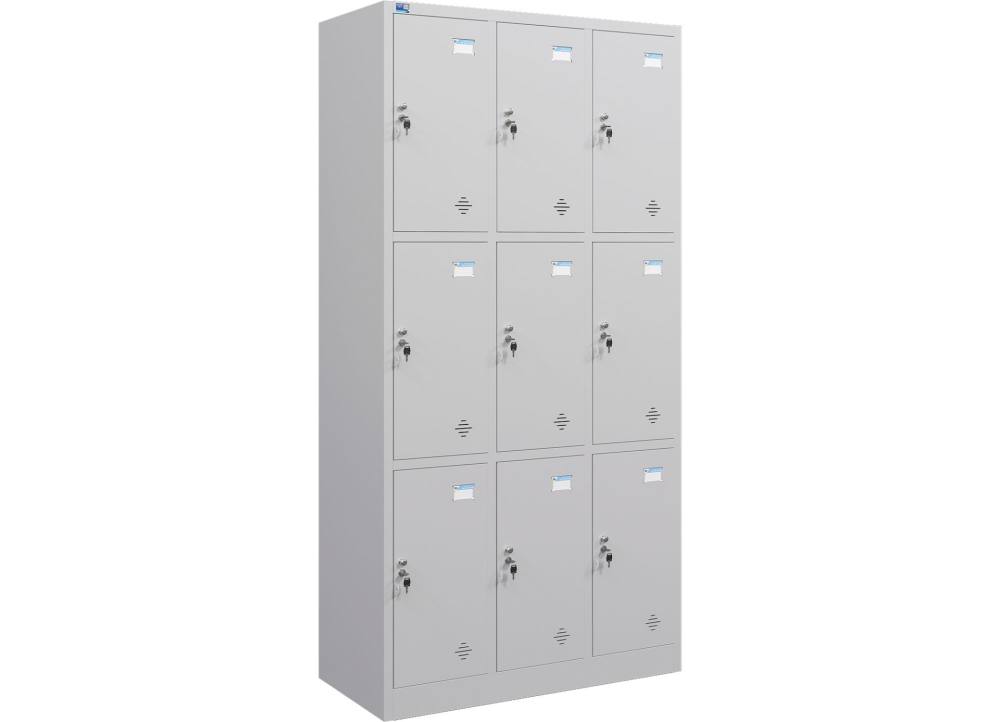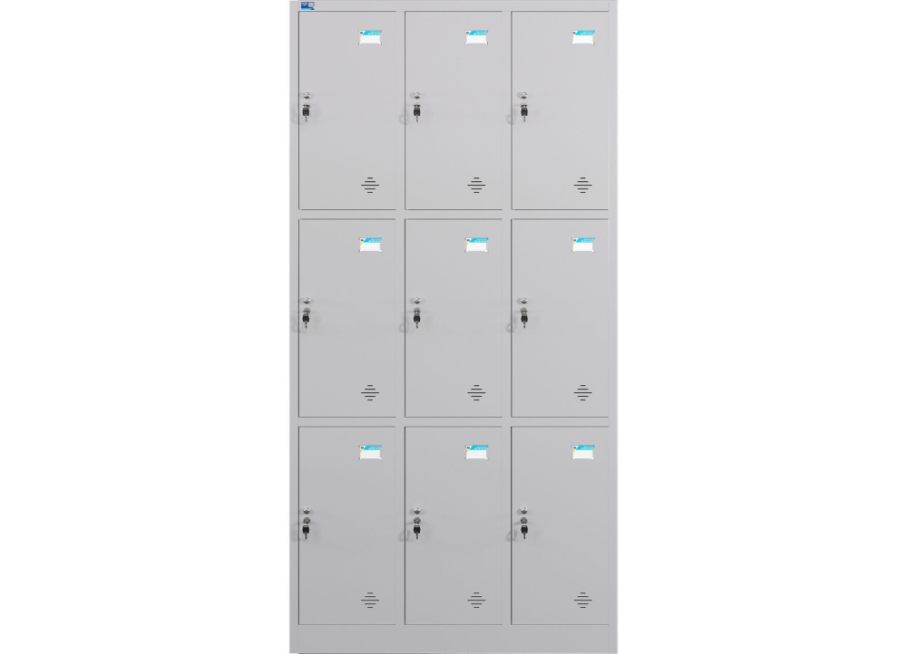 Tủ sắt sơn tĩnh điện 9 khoang cánh mở. Trên mỗi cánh có 1 khóa Locker, núm tay nắm và tai khóa móc.