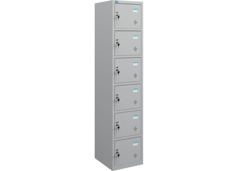 Tủ sắt sơn tĩnh điện 6 khoang cánh mở. Trên mỗi cánh có 1 khóa Locker, núm tay nắm và tai khóa móc.