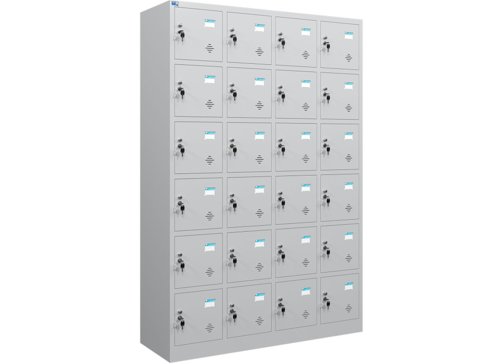 Tủ sắt sơn tĩnh điện 24 khoang cánh mở. Trên mỗi cánh có 1 khóa Locker, núm tay nắm và tai khóa móc.