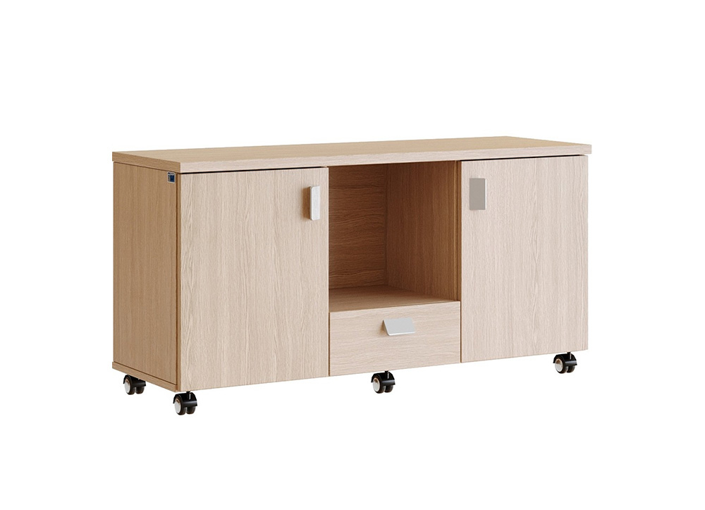 Tủ phụ di động gỗ công nghiệp có 2 khoang cánh mở, ở giữa có ngăn kéo.