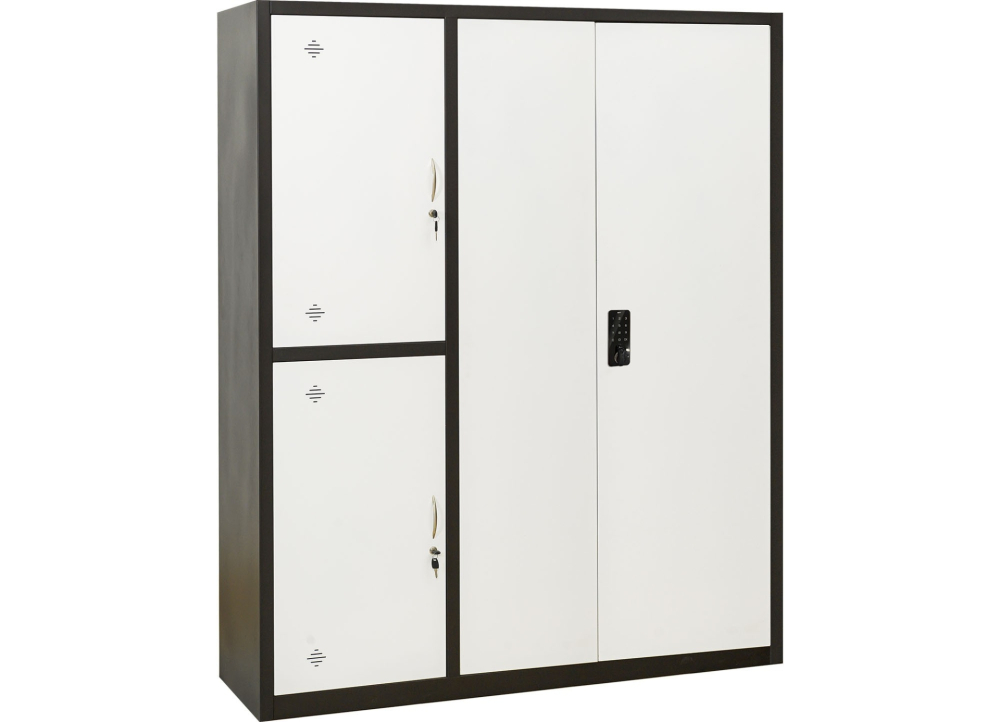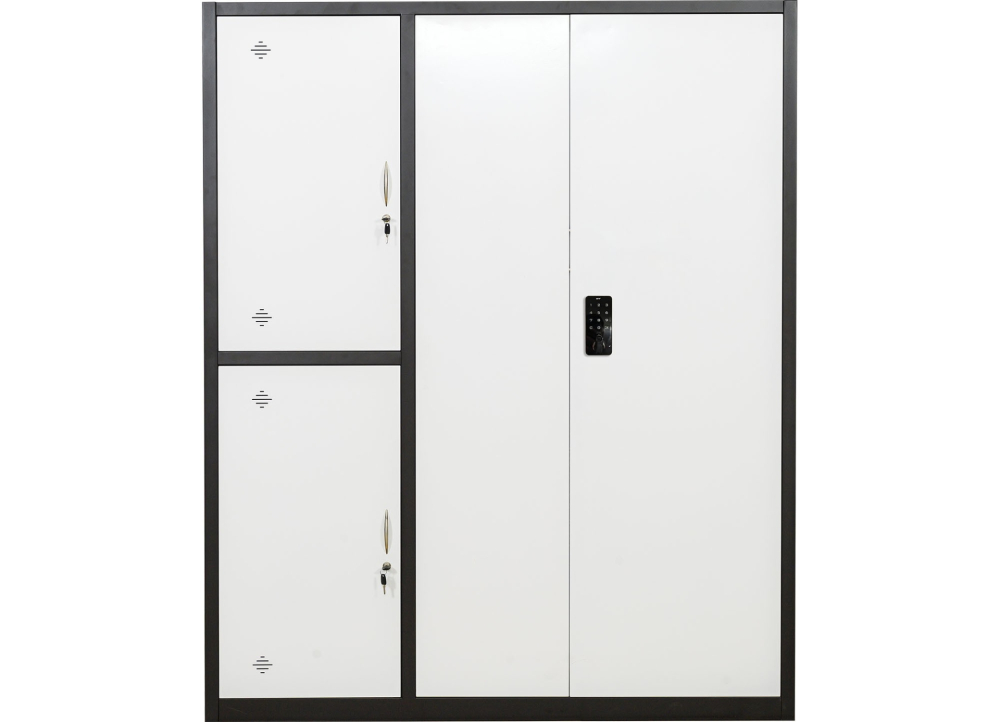 Tủ gồm 3 khoang, khoang phải có 3 đợt di động, cánh tủ lắp khóa điện tử cao cấp, 2 khoang bên trái mỗi khoang có 1 đợt di động, cánh lắp khóa locker và tay nắm mạ.