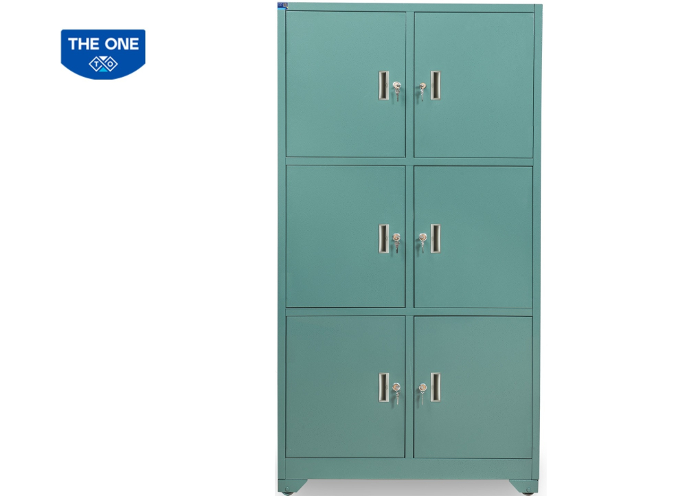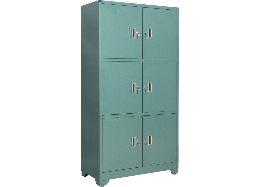 Tủ sắt thép dày gồm 6 khoang. Mỗi cánh có tay nắm và ổ khóa chìa.