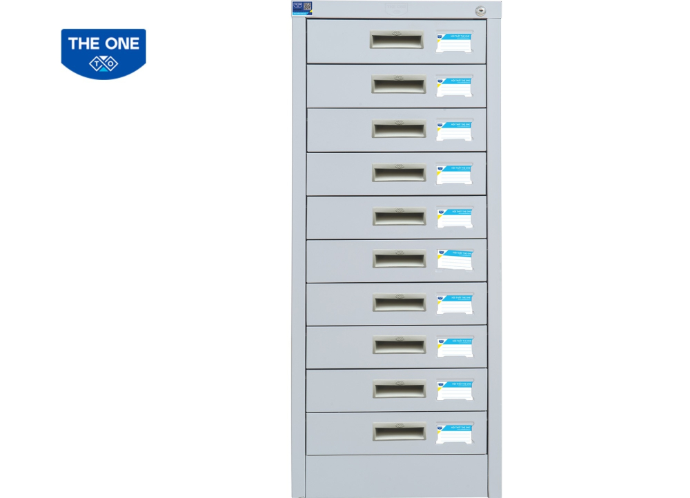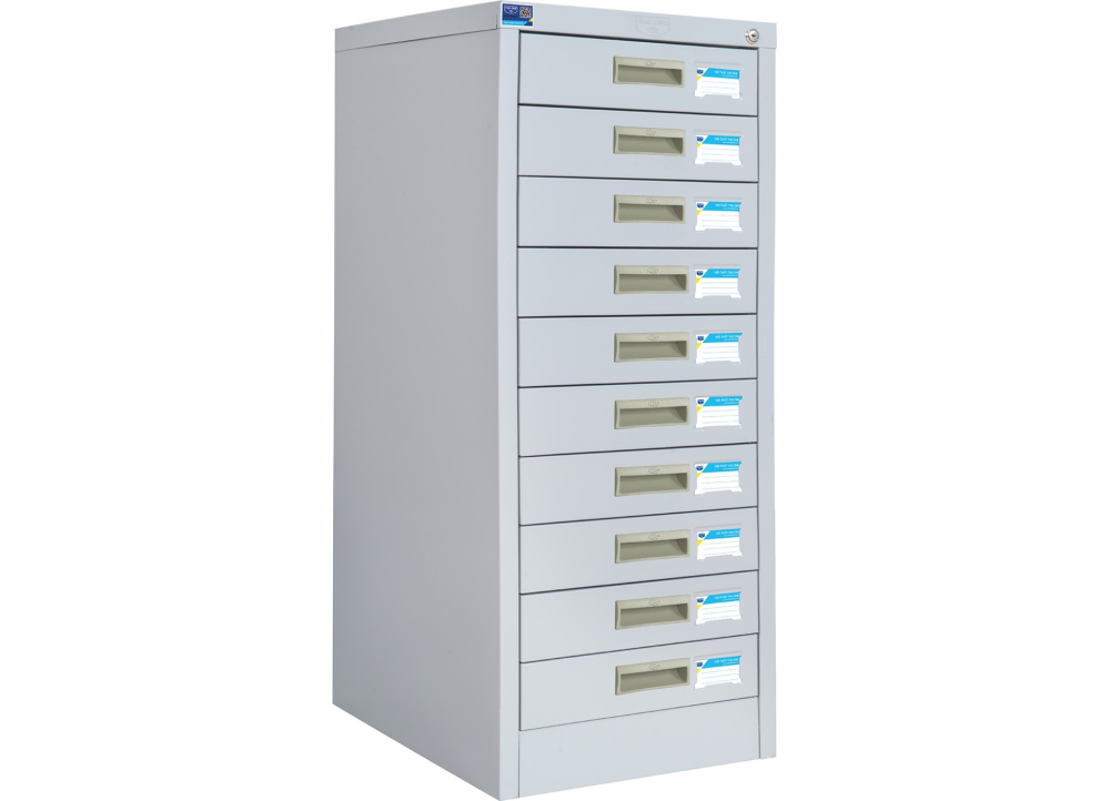 Tủ sắt để file sơn tĩnh điện gồm 10 ngăn kéo chuyển động bằng cơ cấu ray thép uốn.