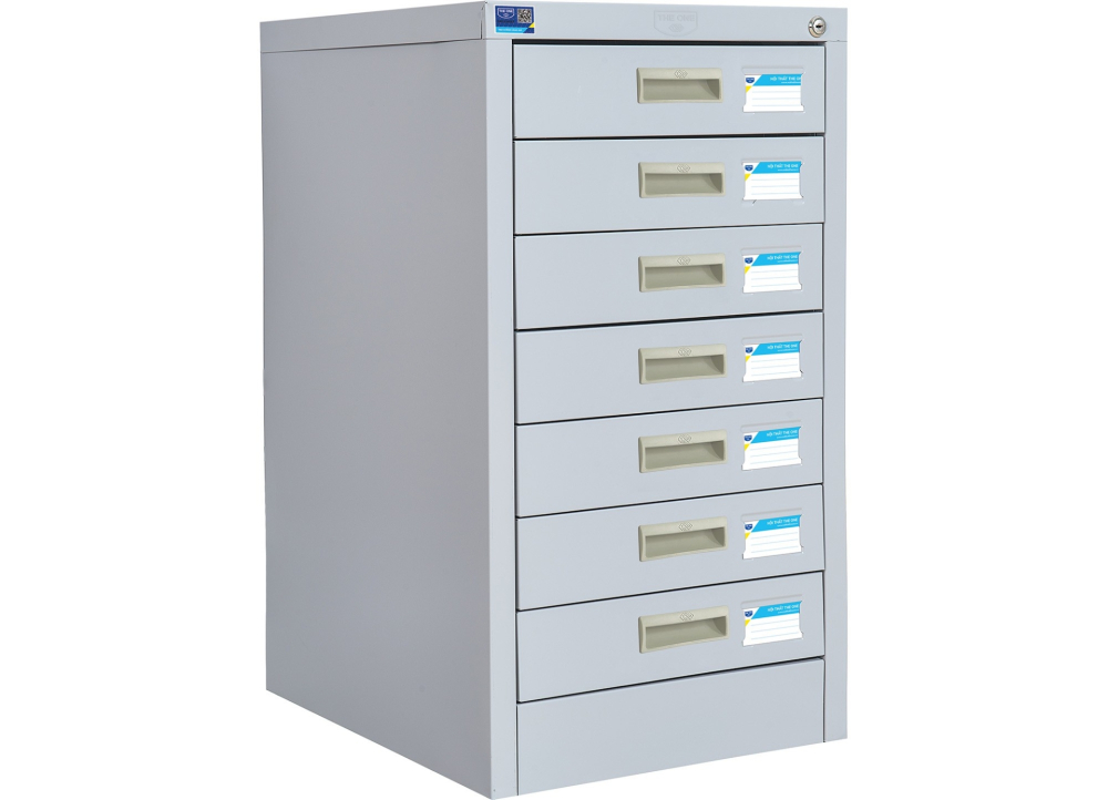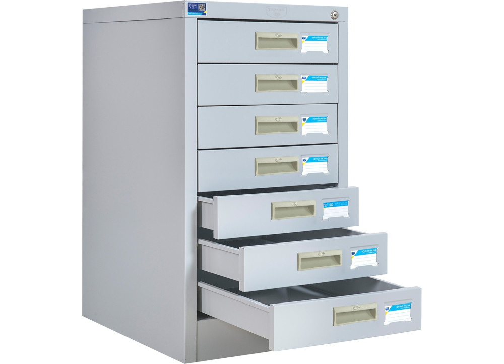 Tủ sắt để file sơn tĩnh điện gồm 7 ngăn kéo chuyển động bằng cơ cấu ray thép uốn.