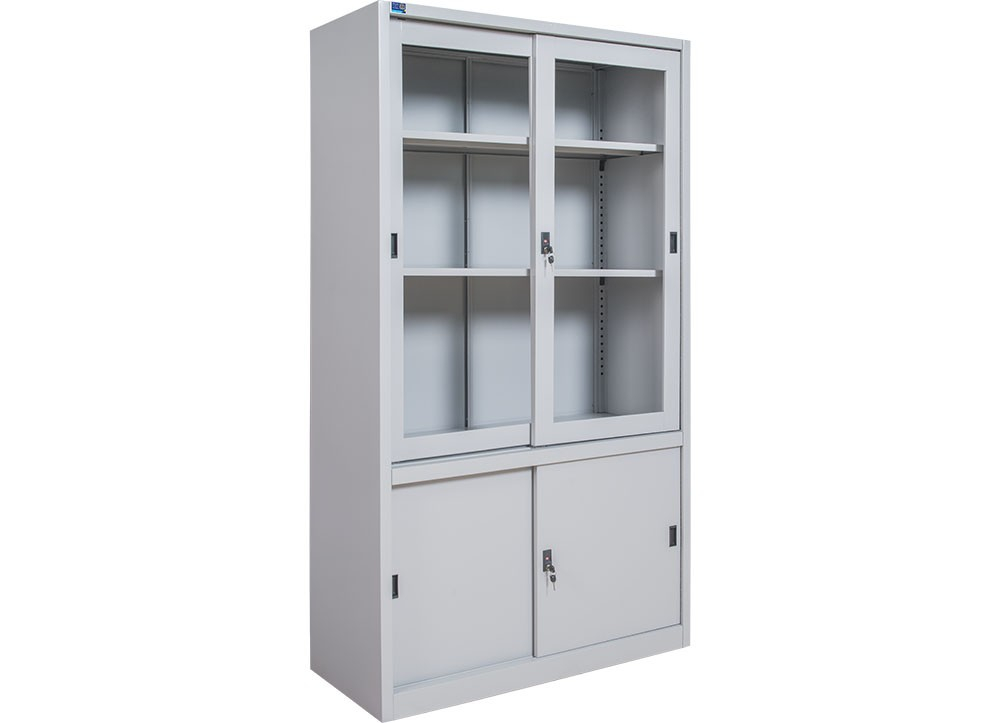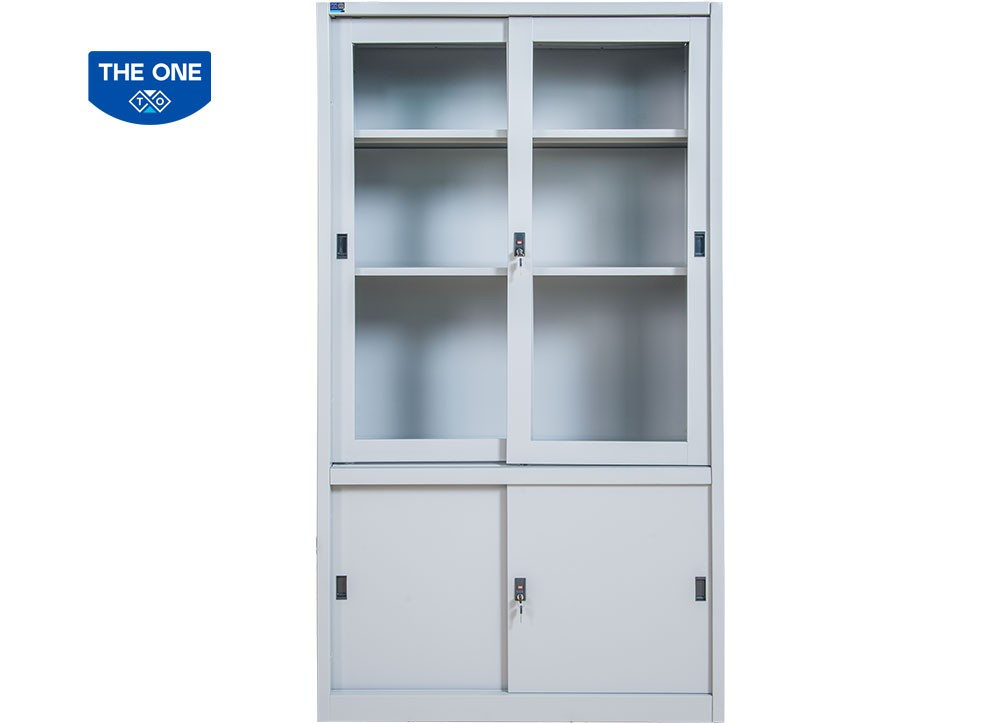Tủ sắt sơn tĩnh điện : Khoang trên có 2 đợt di động, khung cánh kính lùa. Khoang dưới có 2 cánh sắt lùa.